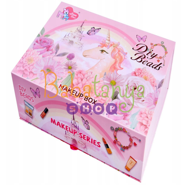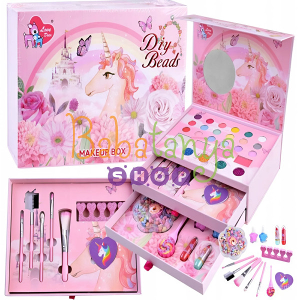 Unikornisos gyerek smink- és ékszerkészlet lányoknak – mosható smink, tükörrel, körömlakkal és gyöngyfűző szettel, 3 fiókos tárolóban